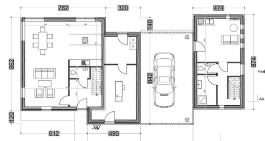 2 habitations séparées par 1 car-port.