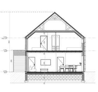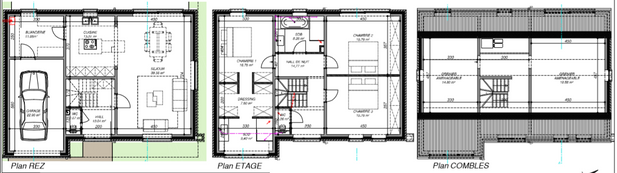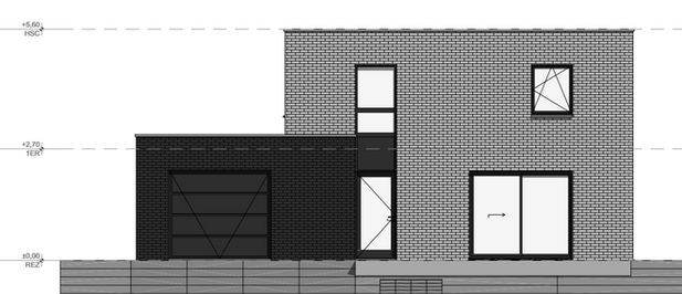 Rez-de-chaussée : hall, living, cuisine, wc, garage, buanderie.